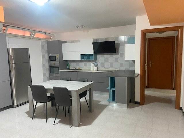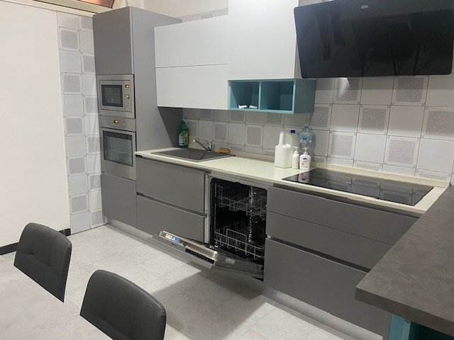 ampio soggiorno con angolo cottura, completamente arredato e accessoriato con frigorifero, forno, lavastoviglie e piano cottura a induzione